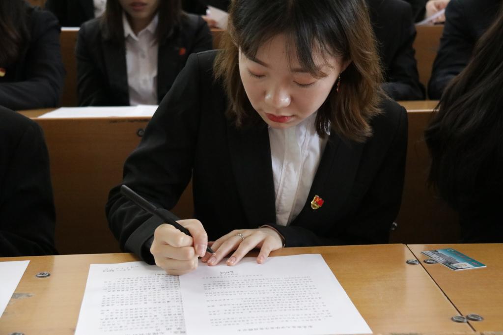 教育活动中,全体毕业生党员现场签署了毕业生党员承诺书,领取了毕业生党员提示卡。丁文鑫代表学院2019届全体毕业生党员发言,向学院辛勤工作、无私奉献的领导和老师表达了深切的感谢和崇高的敬意,分享了作为一名学生党员的收获和体会,最后她向全体毕业生党员发出倡议:要继承艰苦奋斗的精神,发扬锐意进取的精神,坚持务实肯干的作风。