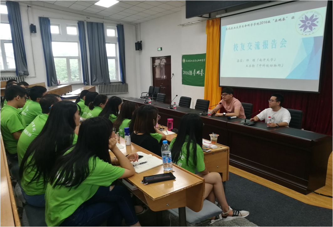 首先,帅领作了《梦开始的地方——马家花园》的主题报告,为大家介绍了自己的四年东农大学生活经历,中国科学院动物研究所周琪院士课题组的六年研究生和博士研究经历以及在南开大学任职博士生导师的收获。以2005级校友的身份向大家分享了在东农的沃土上,怀揣梦想,敢闯敢拼的奋斗过程,用亲身经历告诉大家把握机会、慎重选择、懂得感恩、不断奋斗的重要性。