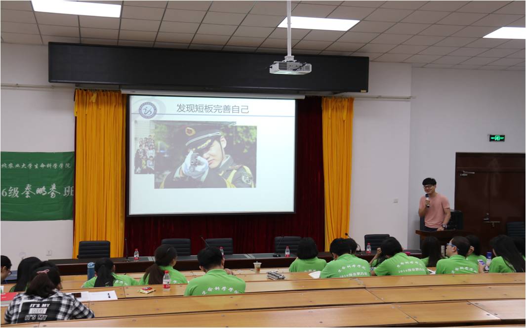 随后,由中科院动物所博士后学者王乐韵作了《做最好的自己,实现中华民族科技创新的跨越式发展》的主题报告。他以自身经历告诉大家做好人生规划的重要性,首先要清楚“你要去哪,你能去哪”,发现短板、完善自己,发挥优势、实现价值,最后要懂得承担责任、奉献社会,并以2009级校友的身份鼓励学弟学妹“唯有勤奋是我们所能长于他人”。