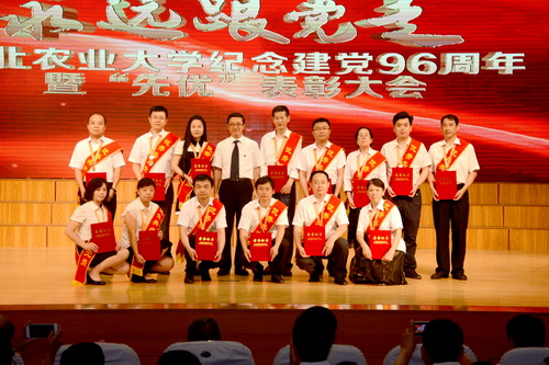 我院生物技术学生党支部获先进基层党组织荣誉称号,刘忠华教授、孙珠红老师获优秀共产党员标兵荣誉称号,高放副书记、王馨悦同学获优秀共产党员荣誉称号。