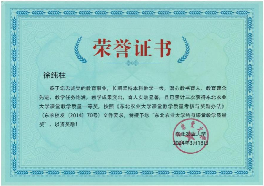 第一次代表学校站在黑龙江省首届青年教师教学基本功竞赛的现场,徐纯柱并没有取得他心中理想的成绩。从那以后,他用几年时间将教学内容的选择、设计、教案样式、ppt制作,甚至细致到服装、形象等每一个细节都研究的很透,用他自己的话说,可以概括为“面面俱到,别具匠心,虚心求教,精益求精”,徐纯柱先后荣获全国高校微课教学比赛一等奖、省青教赛一等奖、省教学创新大赛一等奖等各级各类教学奖励50余项。这些荣誉既诠释了他对教育的热忱,也见证了他将教育融入了生命。
