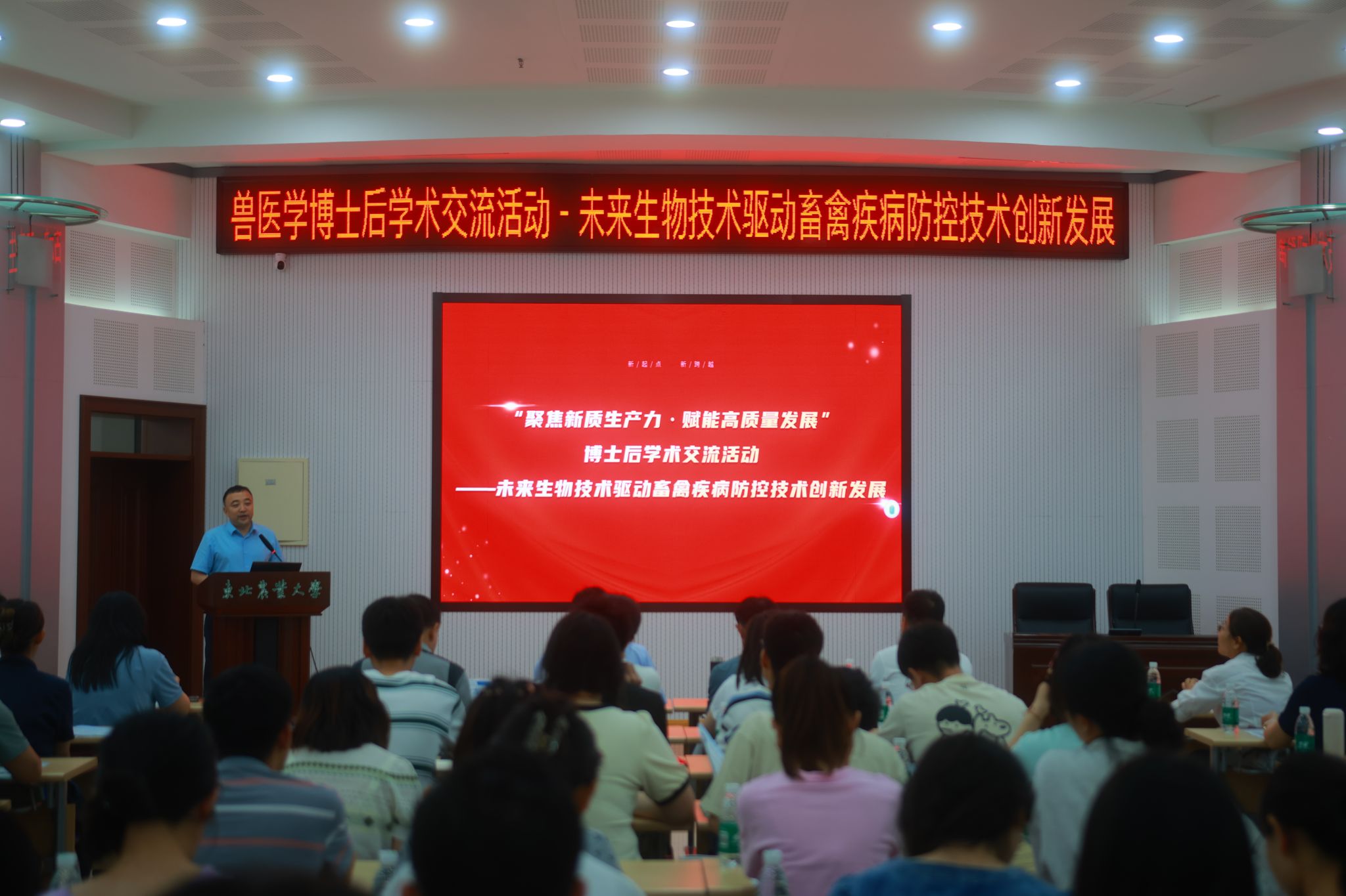 兽医学博士后科研流动站分论坛以“未来生物技术驱动畜禽疾病防控技术创新发展”为主题在图书馆227会议室举行。报告会由动物医学学院院长李金龙主持,吉林大学刘国文教授、贺文琦教授,哈尔滨国生生物科技股份有限公司董事长王云峰及动物医学学院博士后张志云、李雪楠、李亚楠、赵一 、孙哲鹏,博士解伟纯做了专题报告。